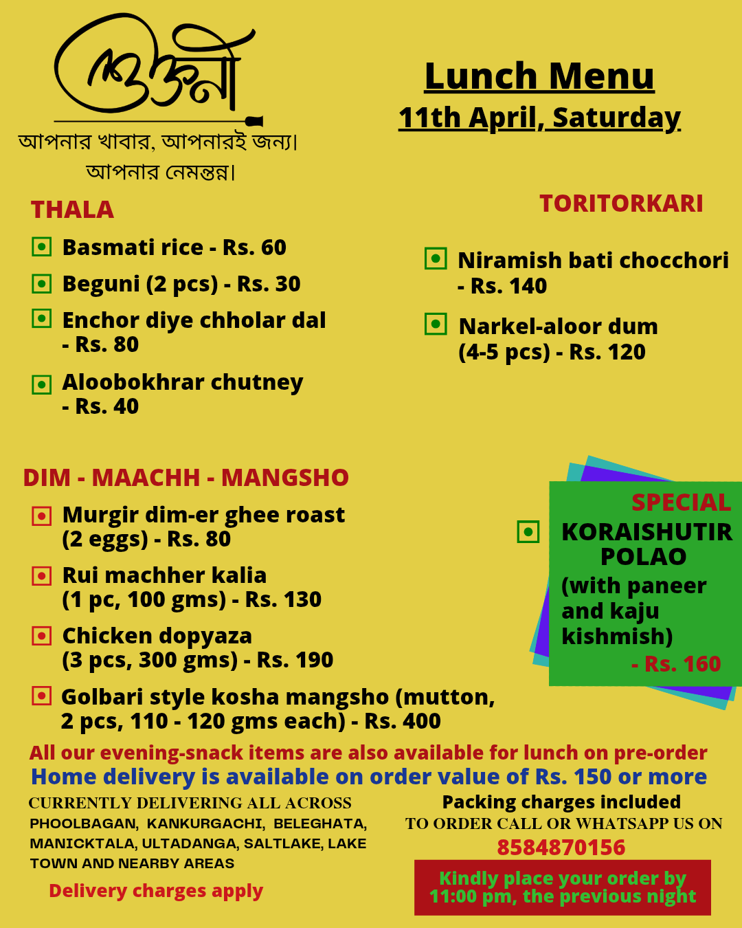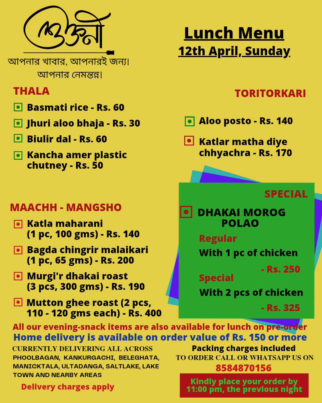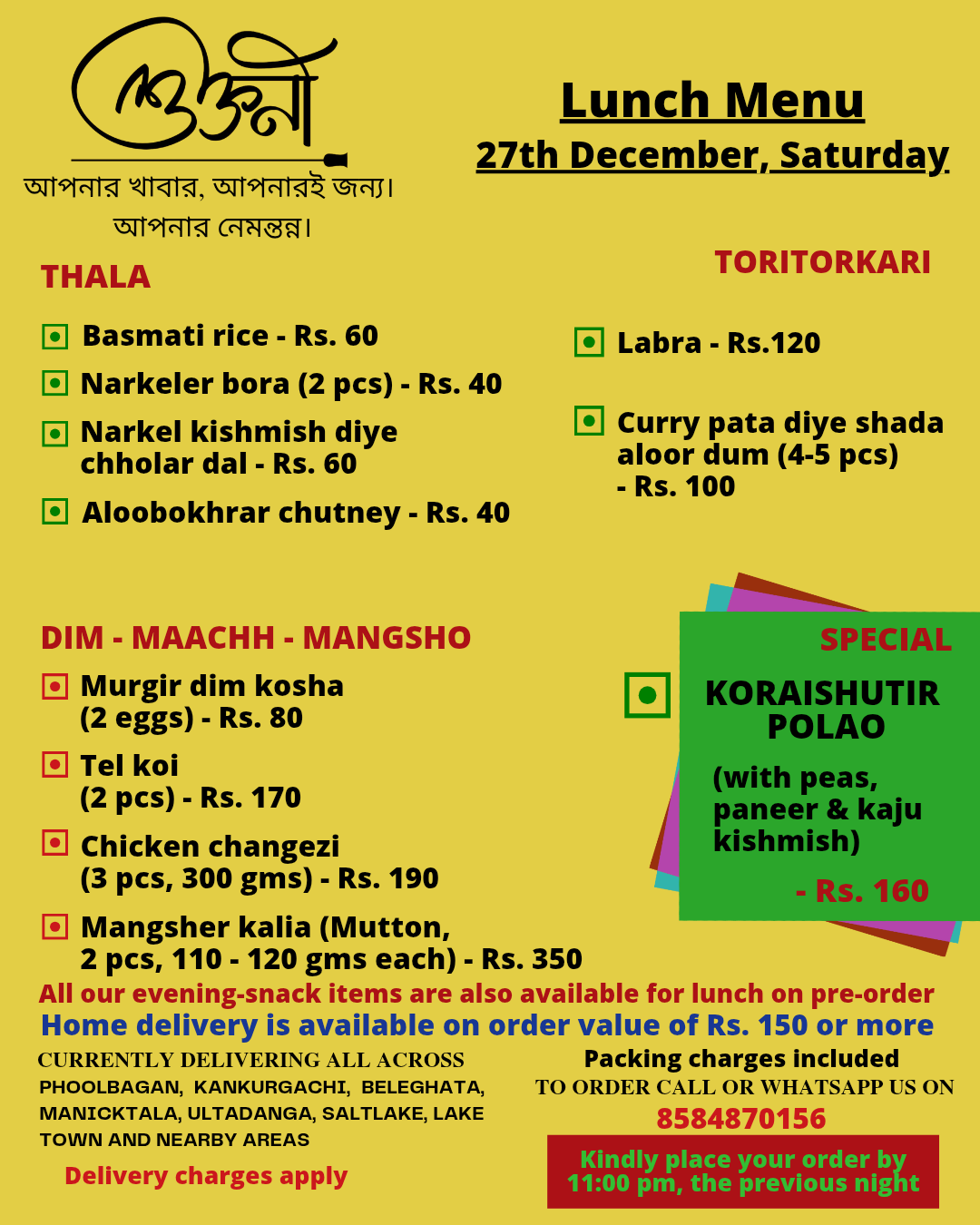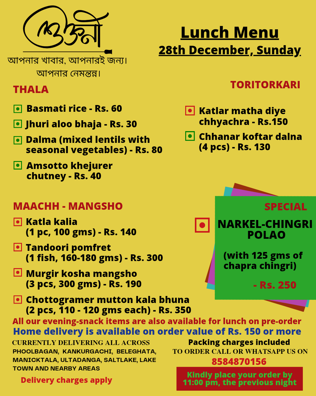 A cloud kitchen in Kankurgachi, kolkata, providing authentic home cooked thalis in both veg and non veg options. We curate a new menu everyday specially for you and deliver food in Kankurgachi, Phoolbagan, Beleghata, Manicktala,Ultadanga, Salt lake, Lake Town and nearby areas. For now we are serving lunch only and We mainly work on pre-orders.