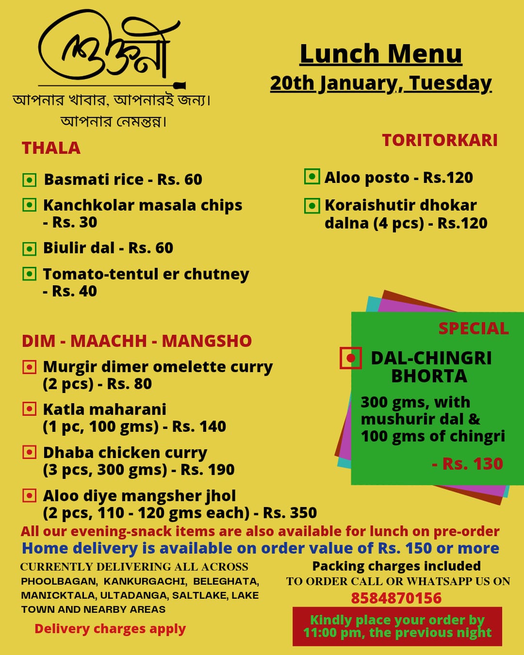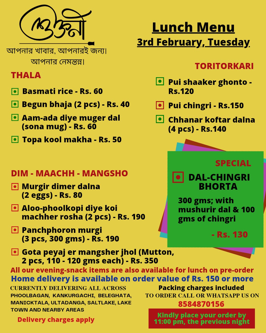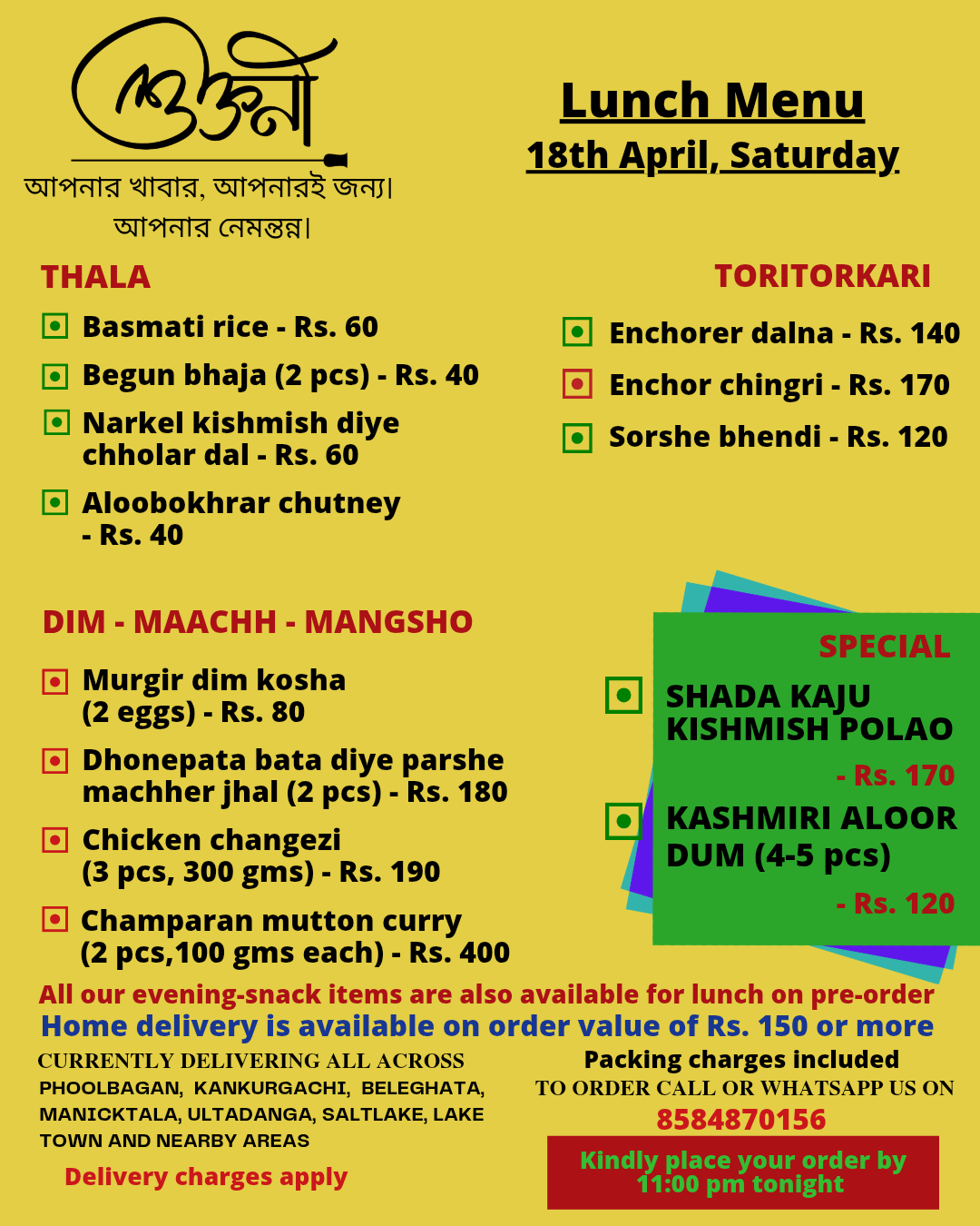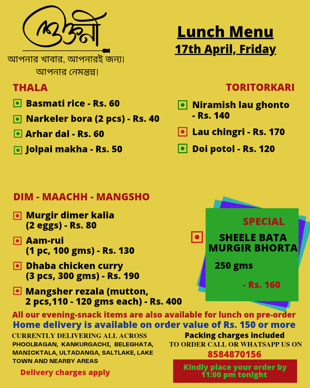 A cloud kitchen in Kankurgachi, kolkata, providing authentic home cooked thalis in both veg and non veg options. We curate a new menu everyday specially for you and deliver food in Kankurgachi, Phoolbagan, Beleghata, Manicktala,Ultadanga, Salt lake, Lake Town and nearby areas. For now we are serving lunch only and We mainly work on pre-orders.