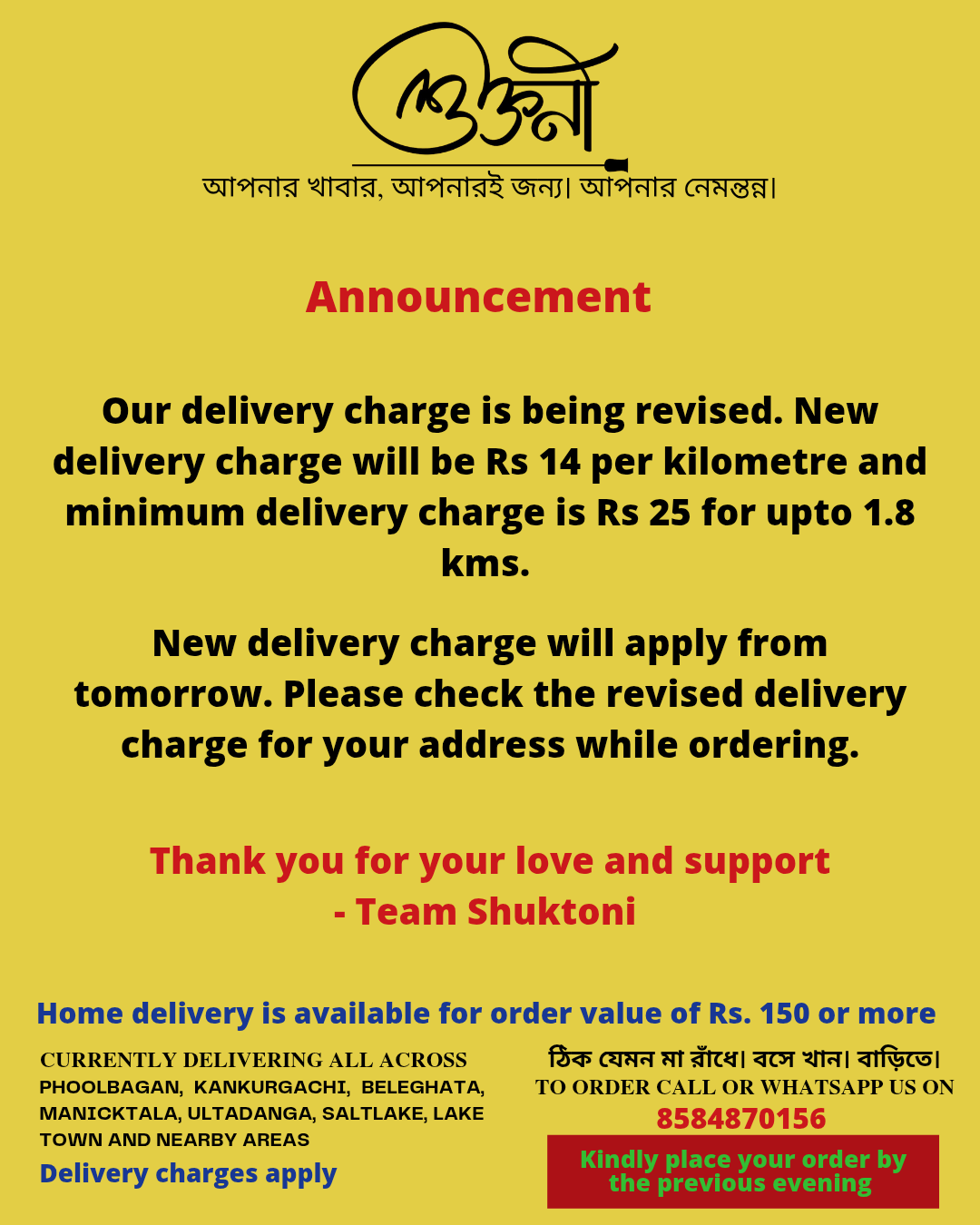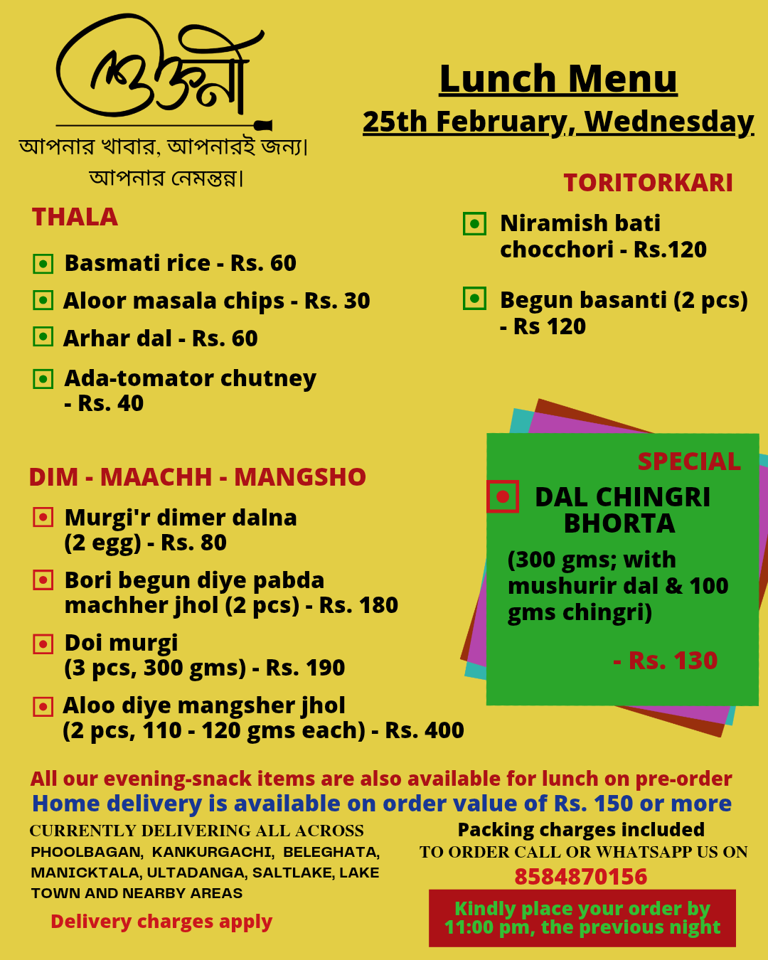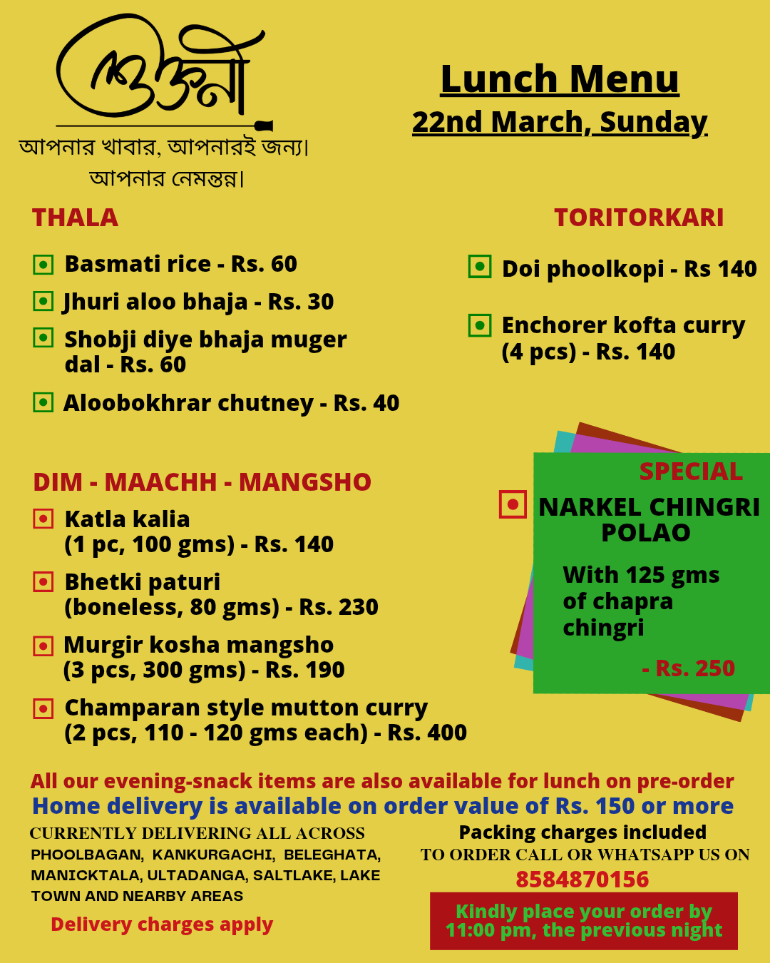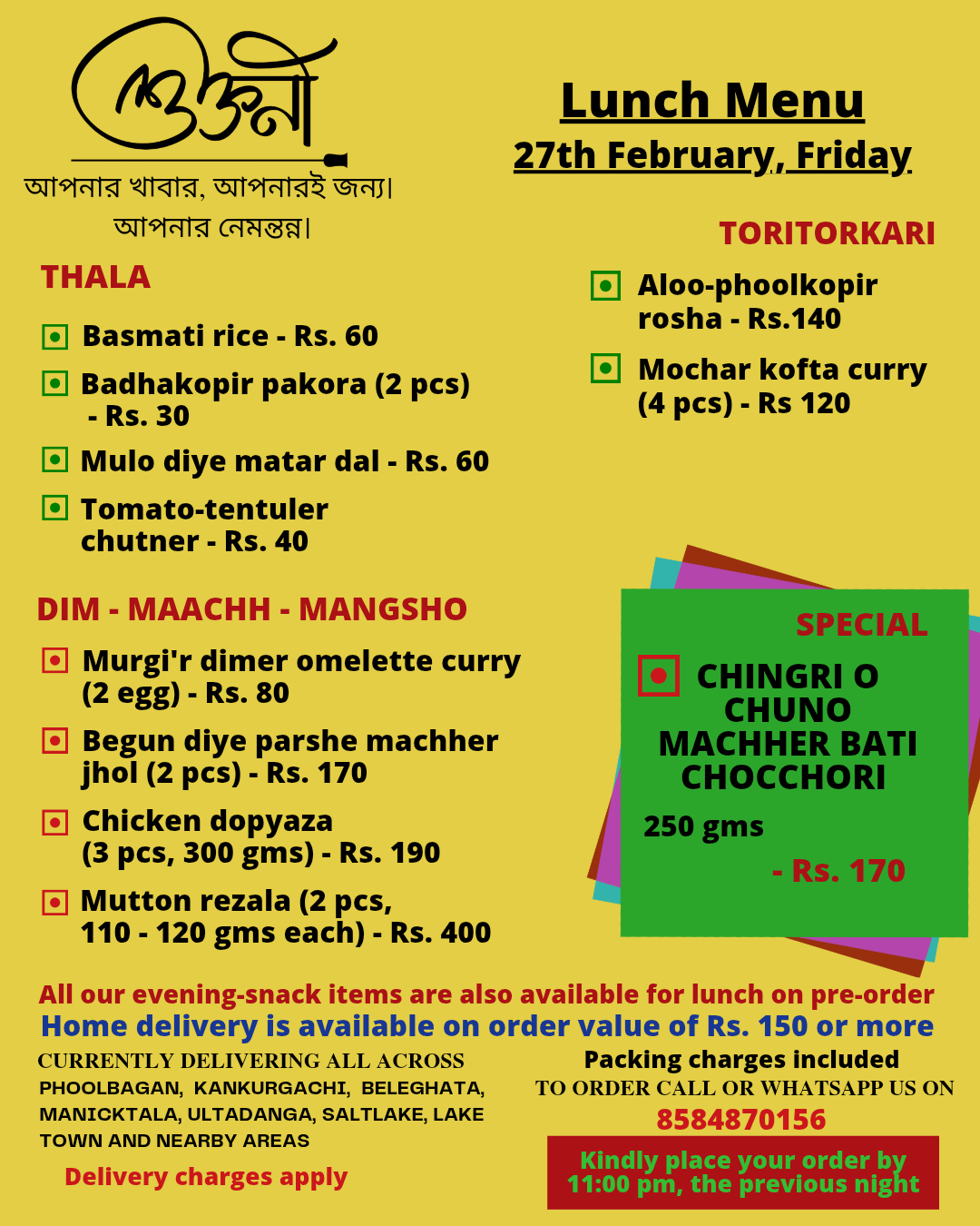 A cloud kitchen in Kankurgachi, kolkata, providing authentic home cooked thalis in both veg and non veg options. We curate a new menu everyday specially for you and deliver food in Kankurgachi, Phoolbagan, Beleghata, Manicktala,Ultadanga, Salt lake, Lake Town and nearby areas. For now we are serving lunch only and We mainly work on pre-orders.